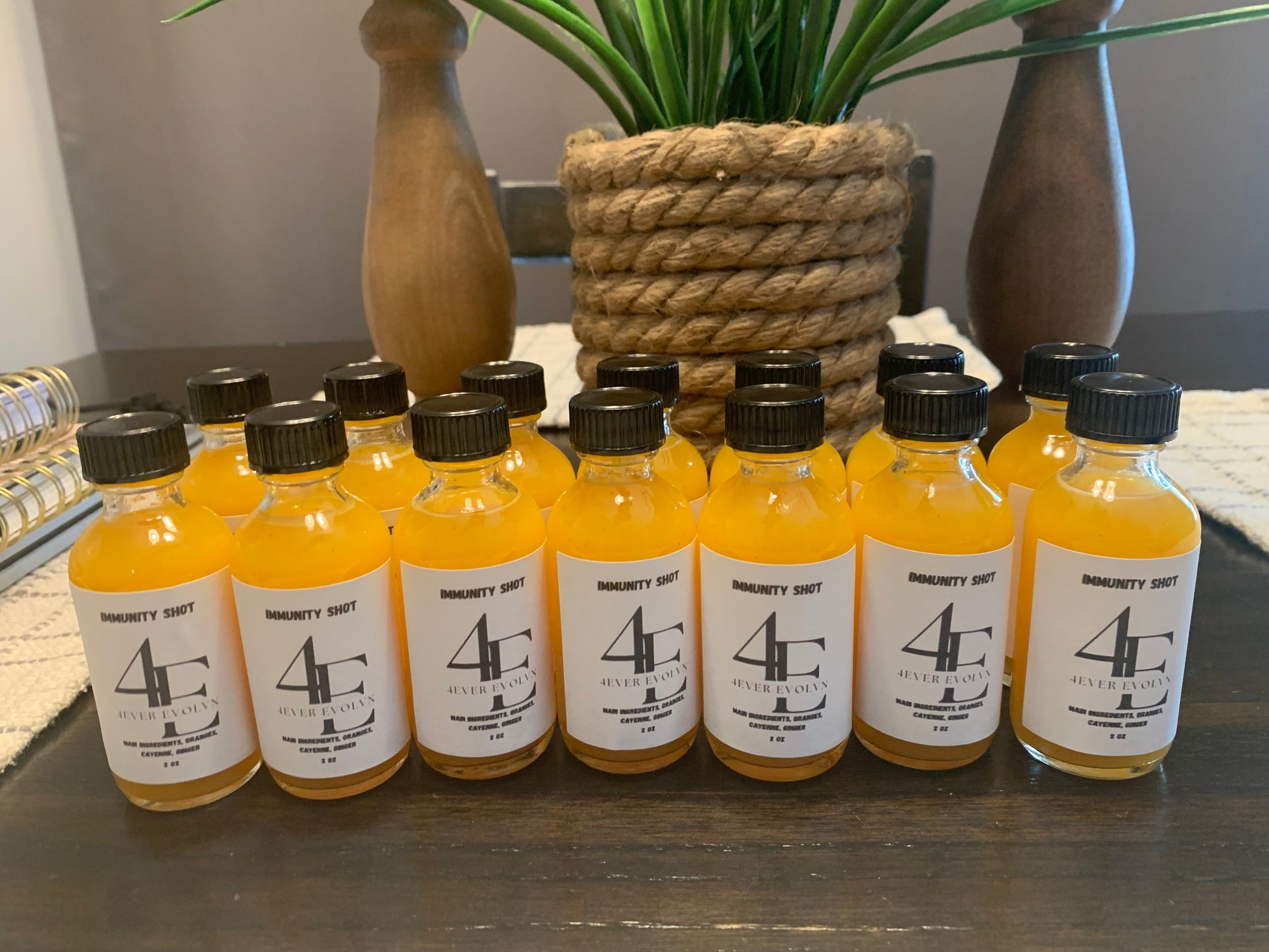 Introducing 4everevolvn Immunity Shots: Special blend with oranges, ginger, and cayenne pepper, your daily dose of vitality in a single shot. Crafted with care, each 2 oz. shot is packed with a powerful fusion of natural ingredients to supercharge your immune system and invigorate your senses.